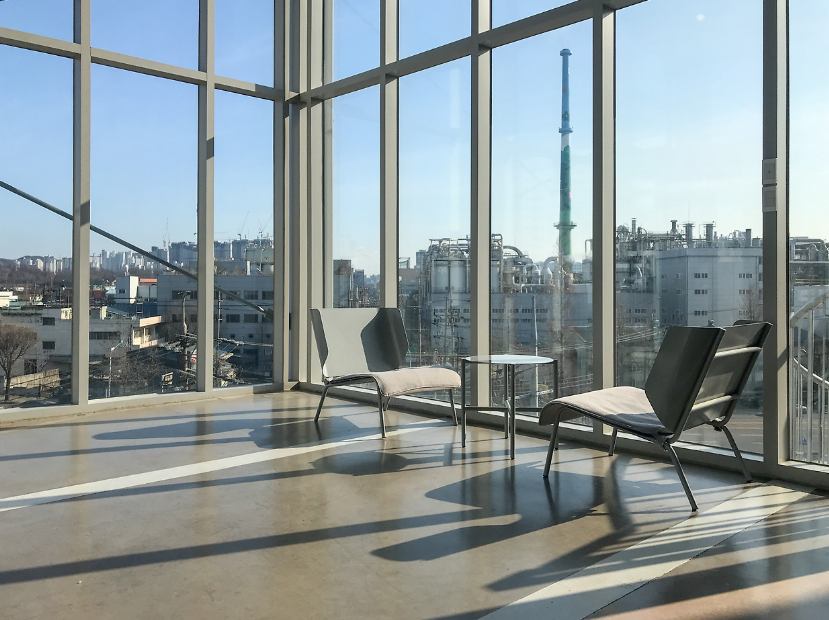 건물 전체가 통유리 + 노출콘크리트 인테리어로 되어 있어서